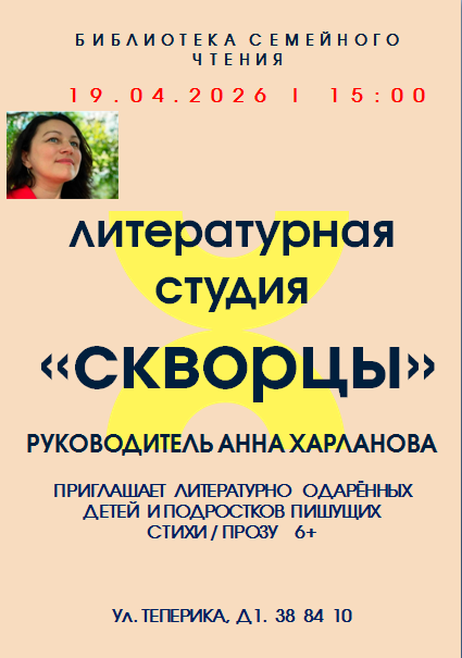 Студия «Скворцы» существует уже шесть лет. Под руководством опытного наставника «литературные скворцы» пробуют писать, сочиняют оригинальные произведения, зачитывают отрывки из них, обсуждают, делятся впечатлениями и дают советы. Встречи всегда проходят в комфортной, непринуждённой обстановке с чаепитием. Участие бесплатное. Приходите!