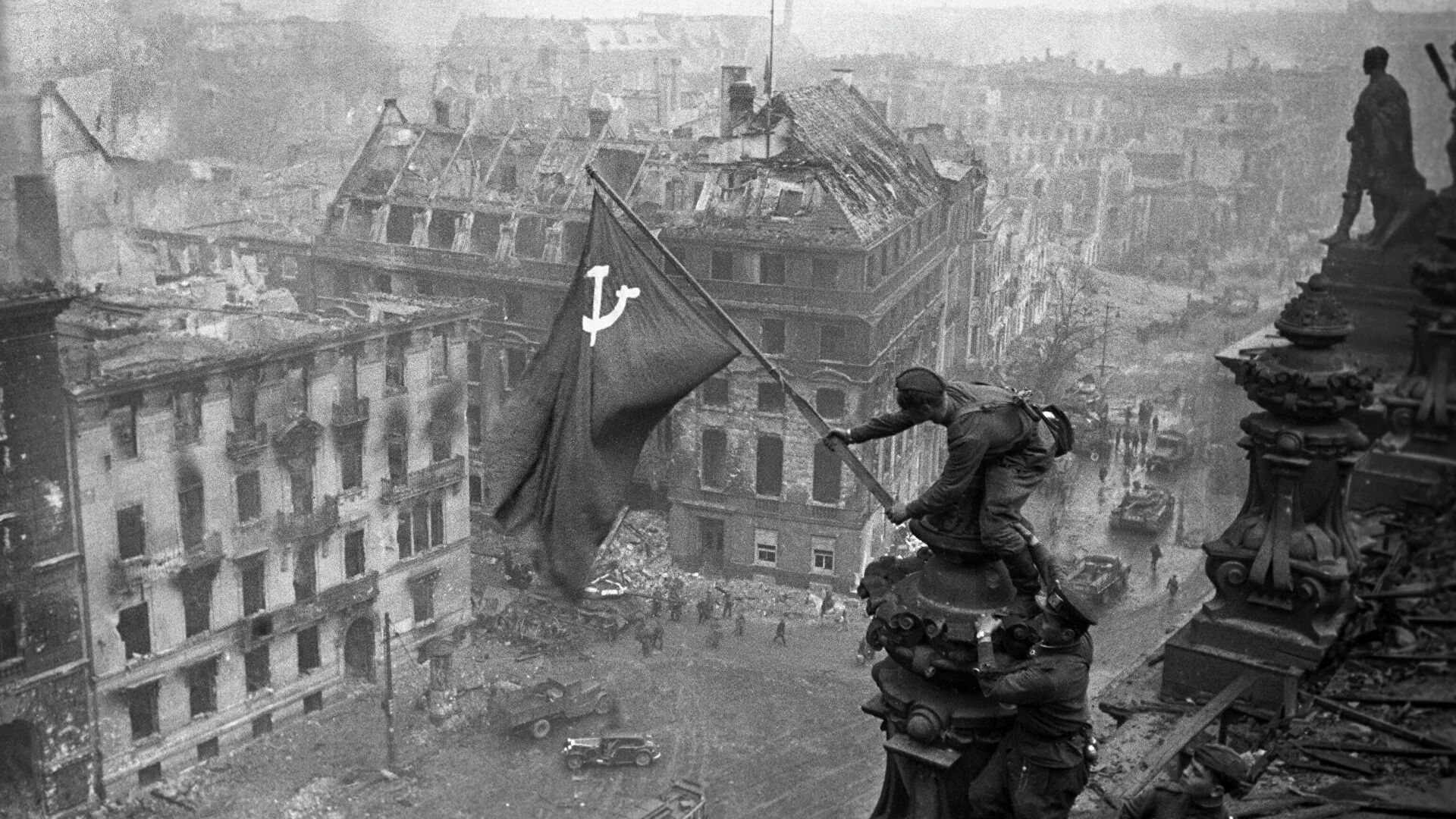 Знамя Победы на здании Рейхстага в Берлине