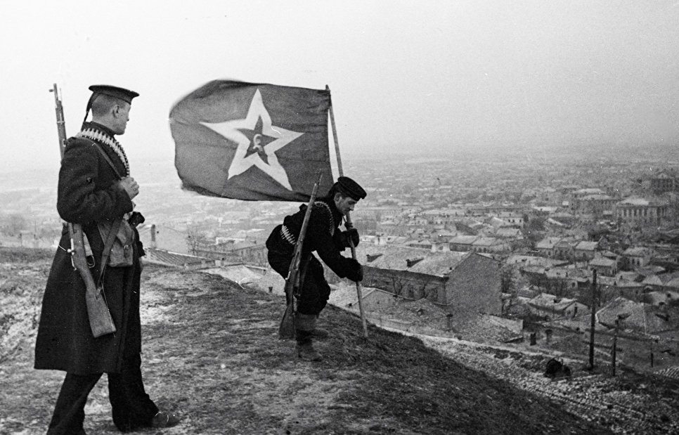 Комсомольцы [краснофлотцы] Вл. Ивашев и Н. Гандзюк водружают флаг на горе Митридат в Керчи