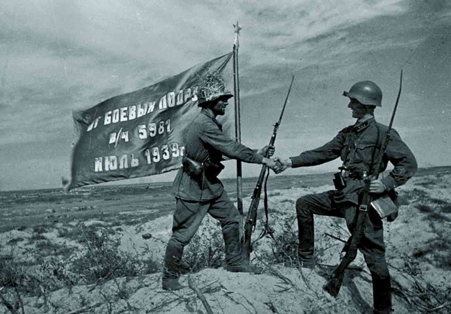 Два красноармейца, обмениваются рукопожатием после водружения знамени на берегу реки Халхин-Гол