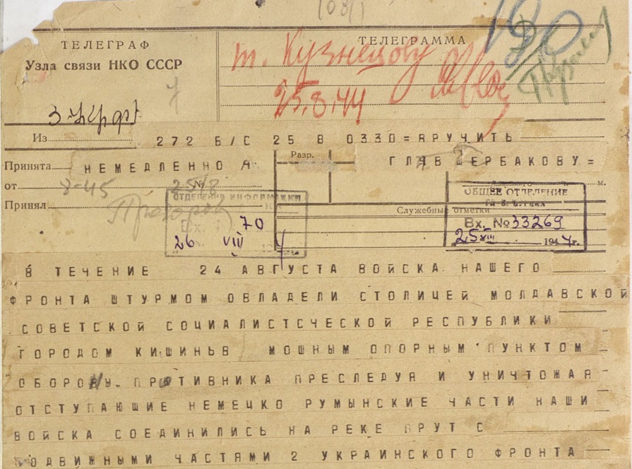 Телеграфное донесение начальника политуправления 3-го Украинского фронта в Главное политическое управление РККА от 25 августа 1944 года об овладении войсками фронта столицей Молдавии — Кишиневом