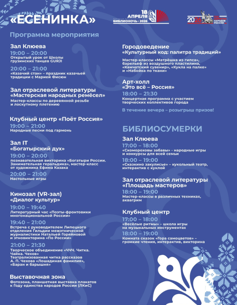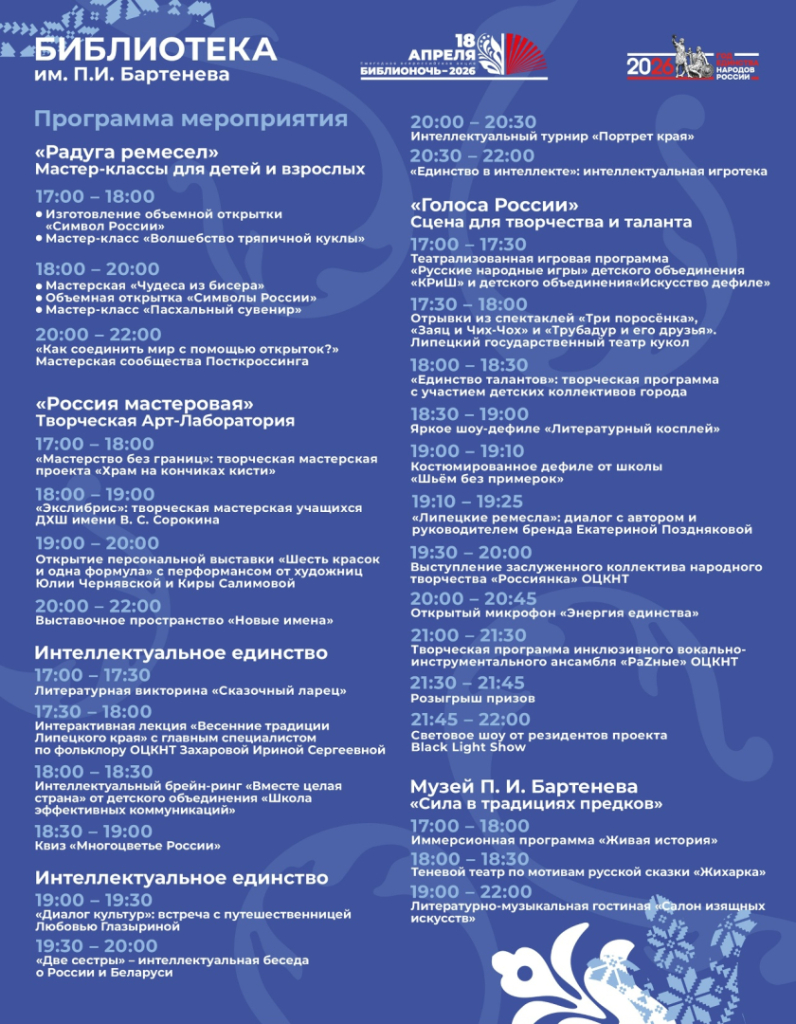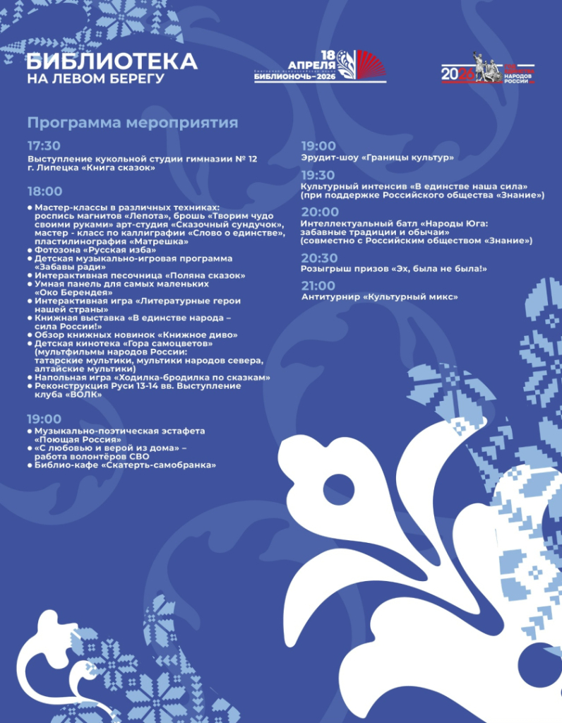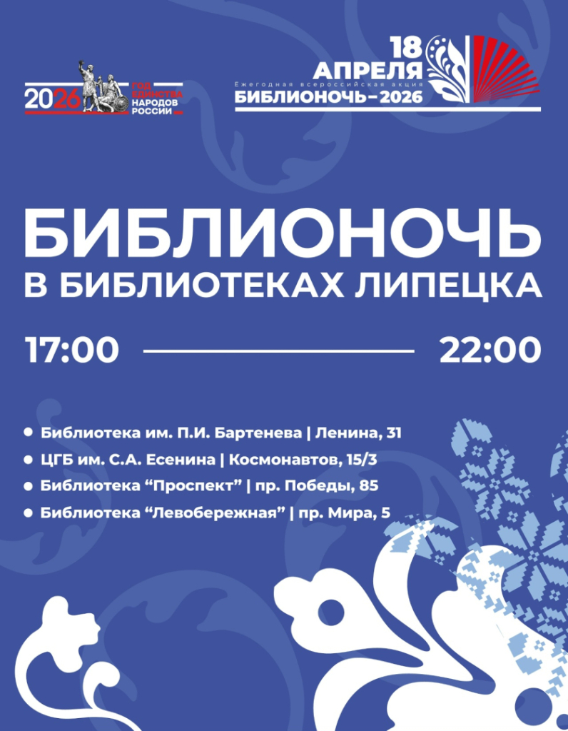 18 апреля в библиотеках Липецка пройдёт ежегодная Всероссийская просветительская акция «БИБЛИОНОЧЬ», посвящённая Году единства народов России. Девиз акции в этом году: «Единство народа – сила России». А это значит, что вы сможете ближе познакомиться с культурой и литературой народов России!