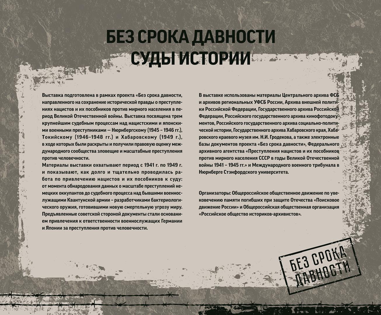 Выставка подготовлена Общероссийским общественным движением по увековечению памяти погибших при защите Отечества «Поисковое движение России» и Общероссийской общественной организацией «Российское общество историков-архивистов» в соответствии с п. 9 раздела 2 поручений Президента Российской Федерации от 30 сентября 2021 г. № Пр-1856 (протокол заседания Российского организационного комитета «Победа» от 9 сентября 2021 г. № 44).