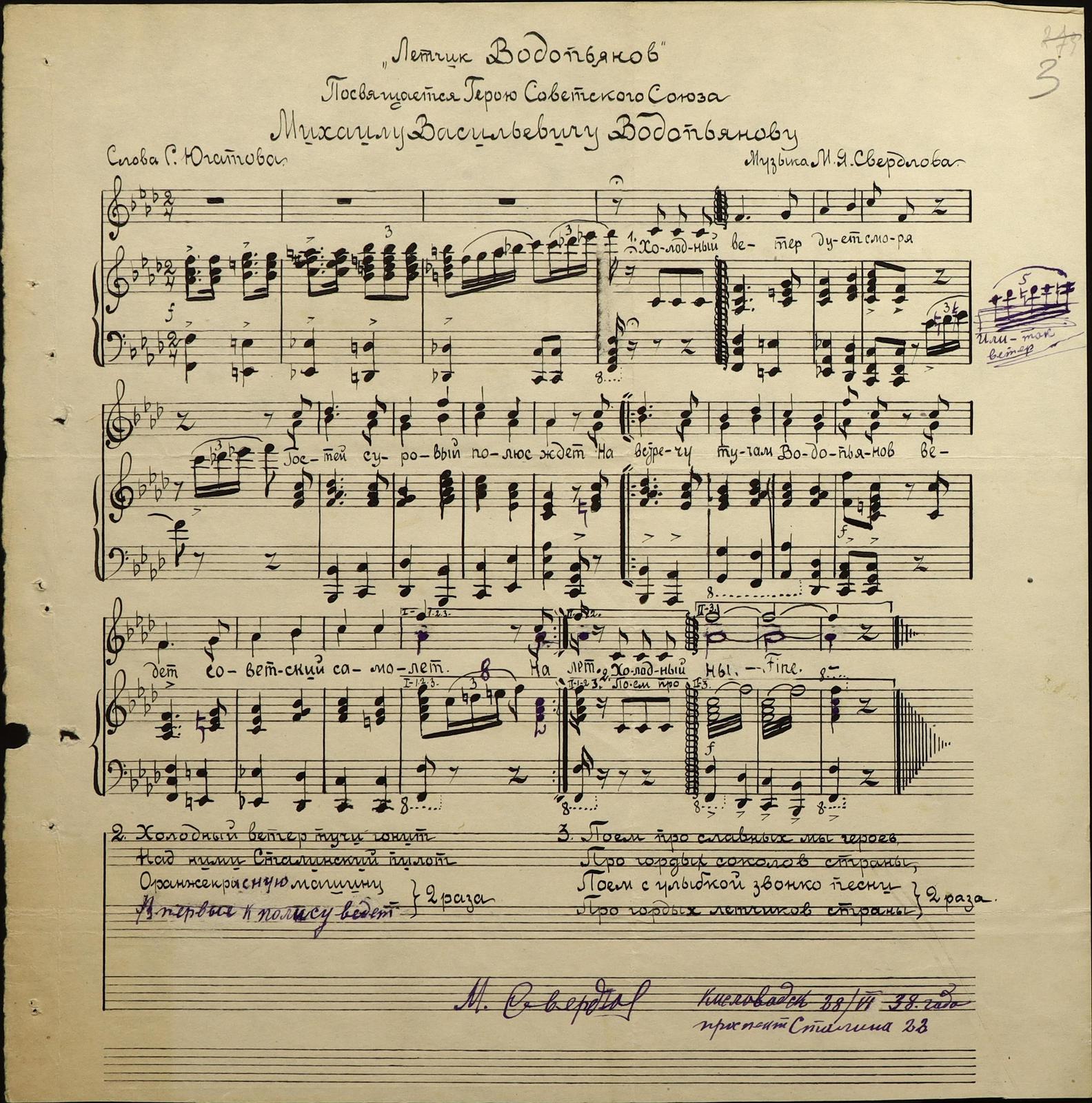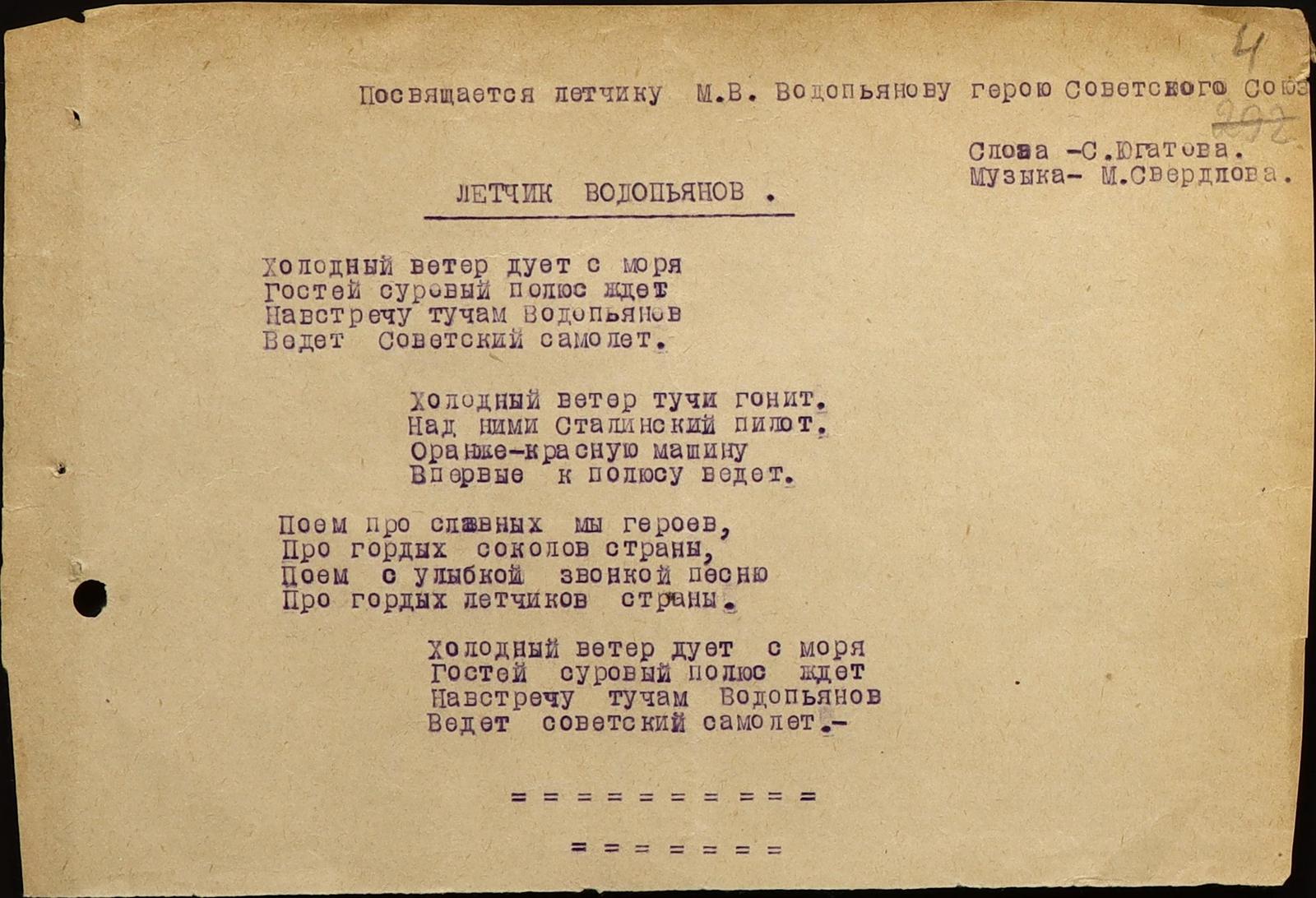 В Государственном архиве Липецкой области хранятся ноты и текст песни «Лётчик Водопьянов», посвящённой полёту М. Водопьянова на Северный полюс.